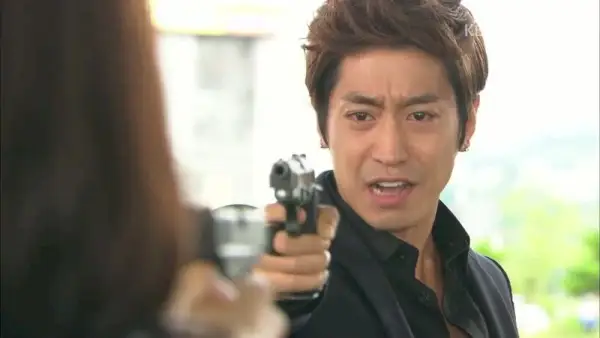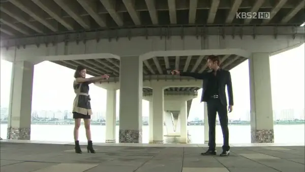 Unter Tränen schüttelt sie den Kopf und lehnt Kang-woos verzweifelten Vorschlag ab. Er fragt: Warum nicht?! Ich sage, ich vergebe dir! Er verliert die Beherrschung, richtet seine Waffe nach oben und schießt die Patronen in den Himmel, dann lässt er die Waffe vor seinen Füßen fallen.
